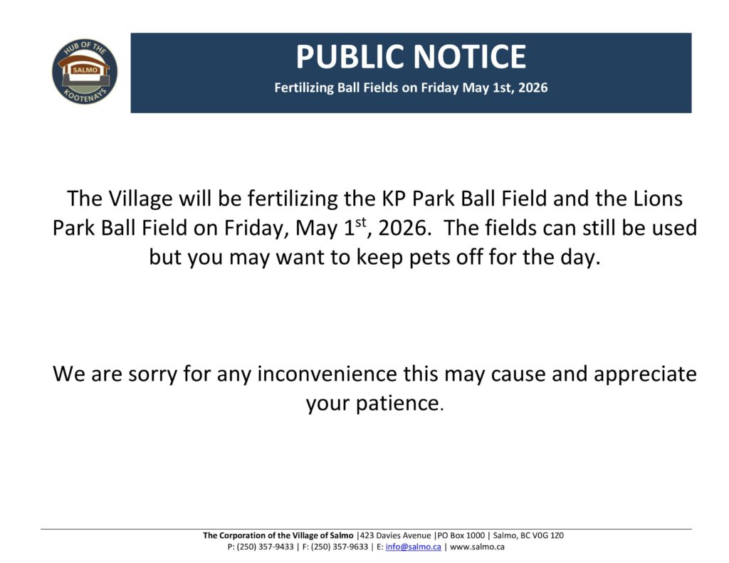 PUBLIC NOTICE - Fertilizing Ball Fields on Friday May 1st, 2026