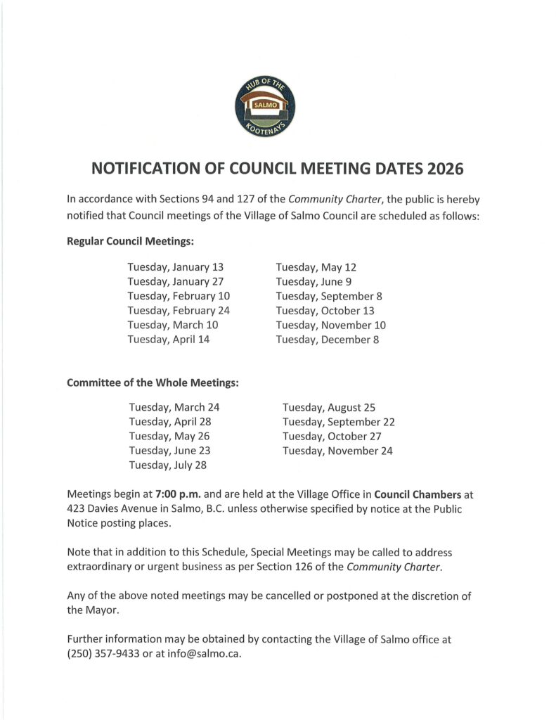 With the adoption of Council Procedure Amendment Bylaw #768, 2026, changes have been made to the council meeting schedule. Please see below for the updated schedule.