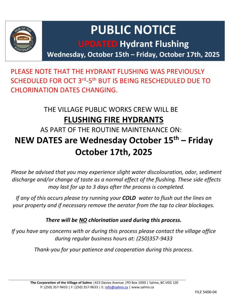 UPDATED PUBLIC NOTICE - Hydrant Flushing Wednesday, October 15th - Friday October 17th, 2025